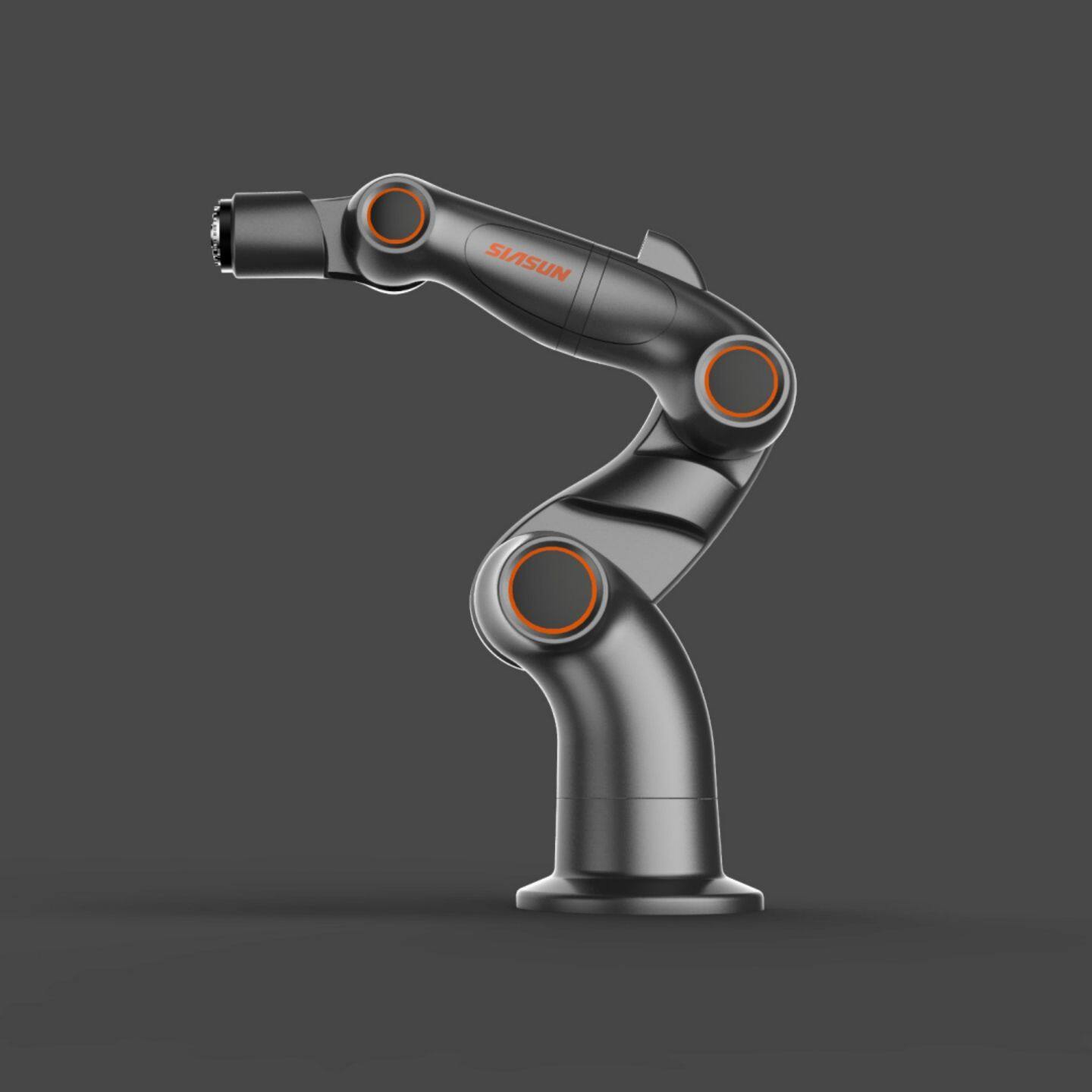 从外观风格入手,融合科技感与现代美学,采用流畅线条与简洁造型,搭配鲜明色彩点缀(如橙色、蓝色元素),打破传统机械臂的刻板印象,增强视觉吸引力。同时,强化品牌标识的融入,将 “SIASUN” 品牌元素巧妙置于机械臂关键部位,提升品牌辨识度。