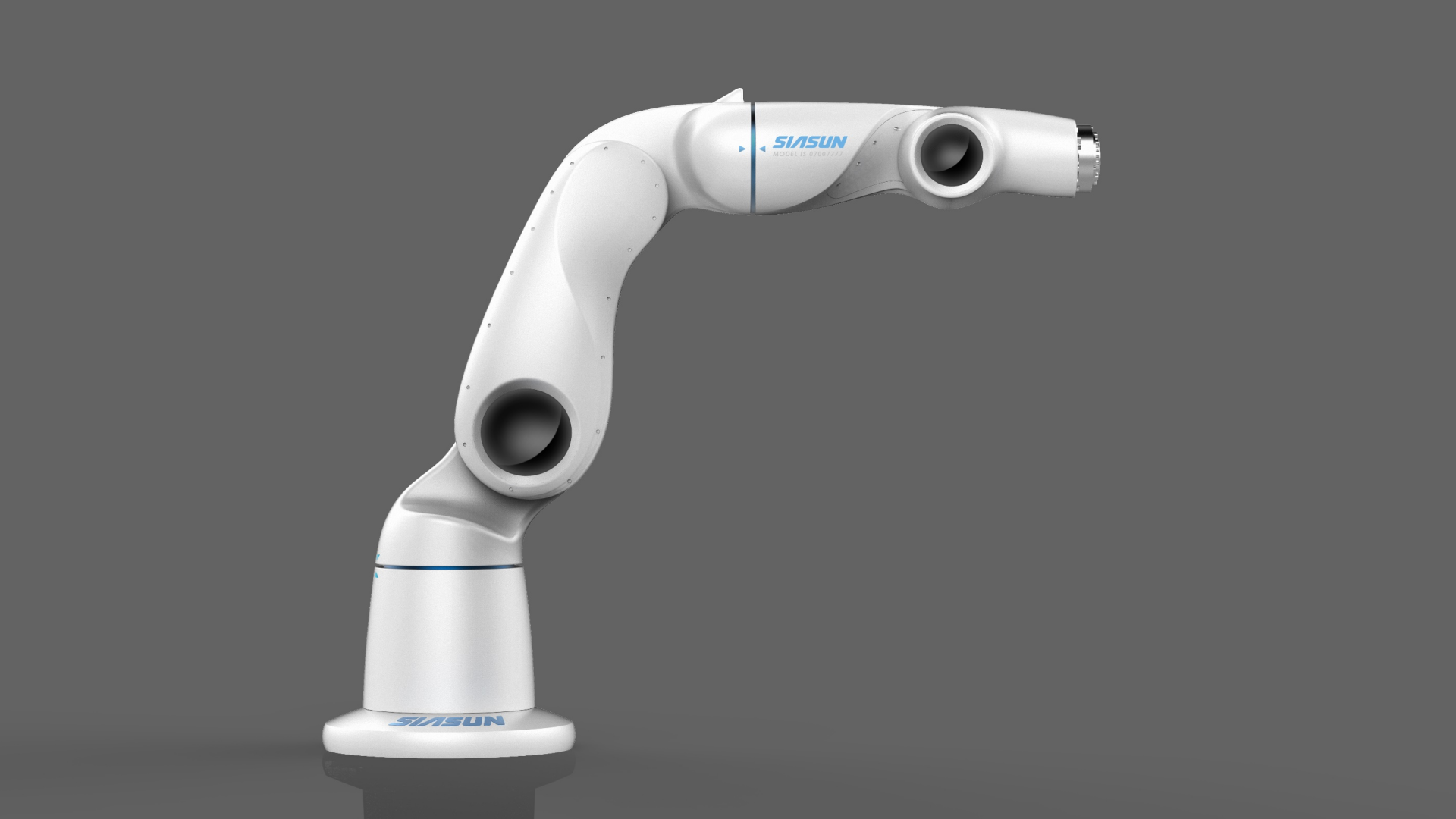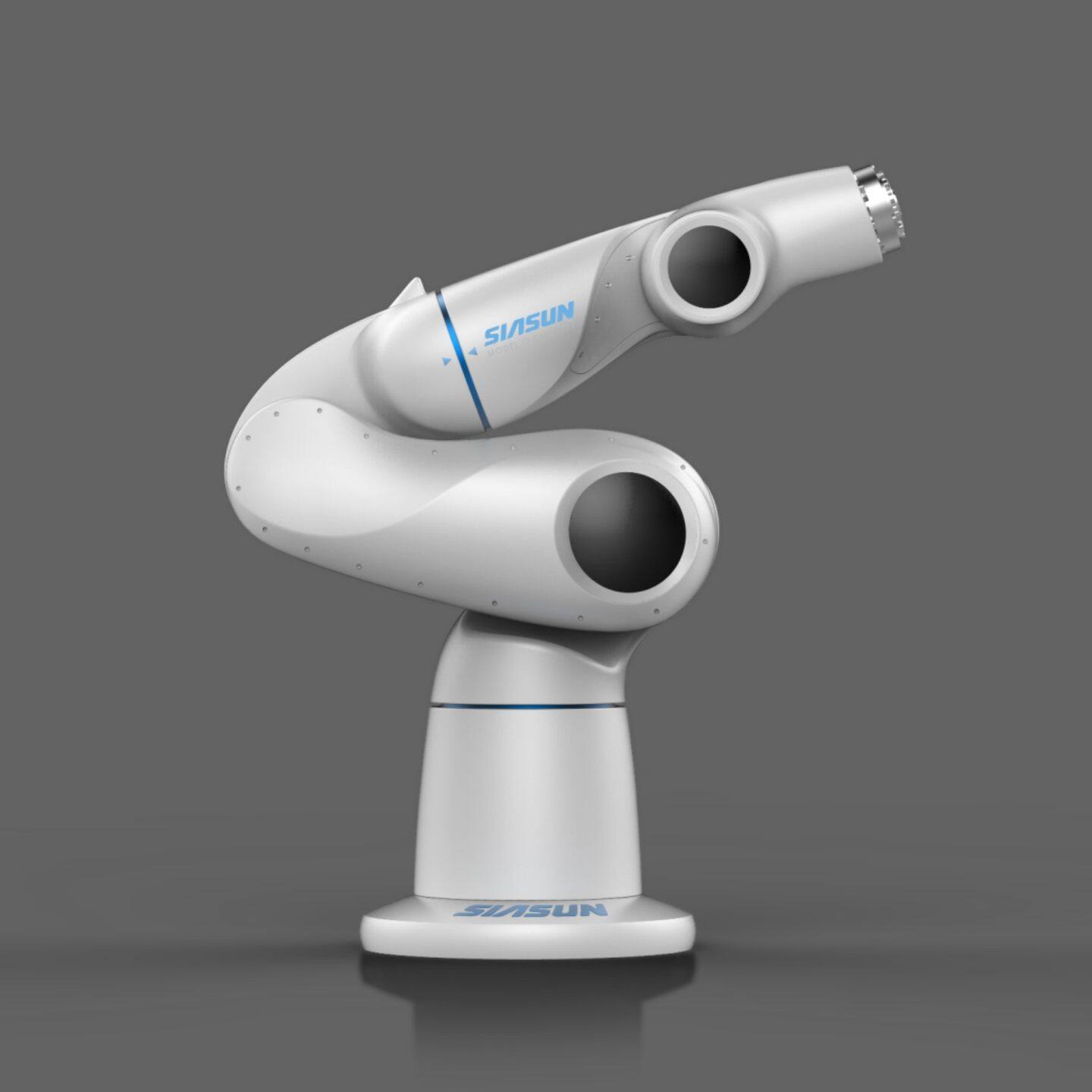 2.在色彩与标识应用上,精心选择配色方案,灰色款以橙色圆环装饰关节,增强科技活力;白色款以蓝色线条与品牌标识呼应,营造简洁专业氛围。将品牌名称 “SIASUN” 以清晰、醒目的方式标注在机械臂主体,强化品牌展示,使机械臂成为企业科技形象的移动名片。