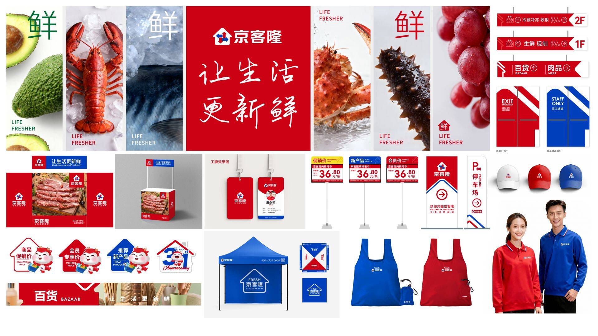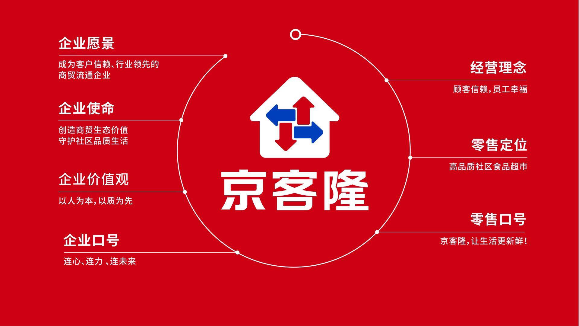 新Logo不仅是一个视觉符号,更是“让生活更新鲜,从社区到家”这一承诺的具象表达。箭头象征持续的新鲜输送,“家”代表温暖与守护,两者融合,强化京客隆作为“高品 质社区生鲜食品超市”的市场定位。
