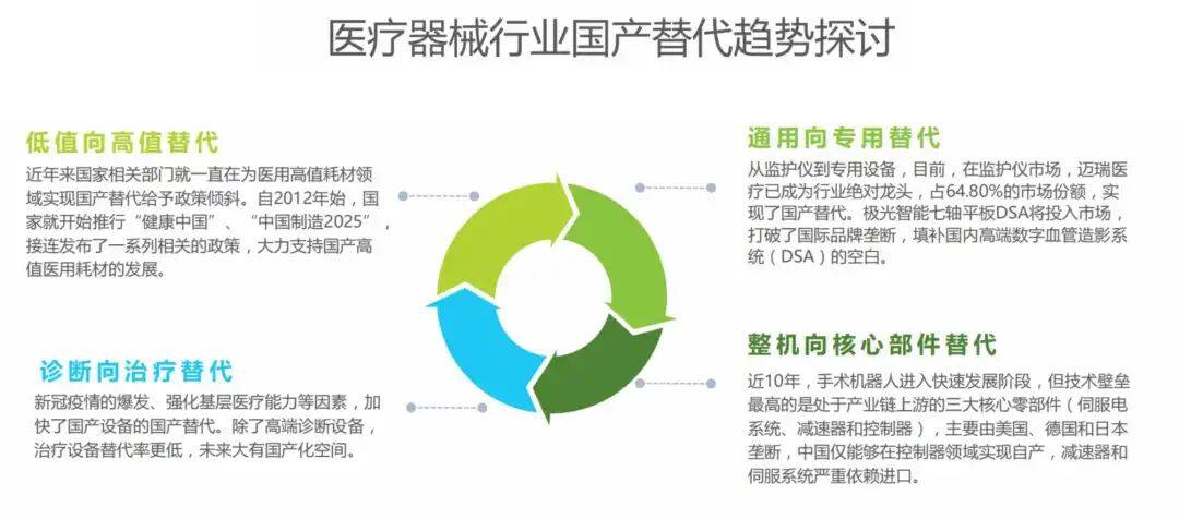 谈及医疗行业形势,陈臣分三个板块进行了解读。首先是中国医疗器械市场的规模,整体增长空间巨大,预计在2030年达到近3万亿元市场规模;其次是国内医疗产品国产替代的数据呈现,低值耗材已经实现了国产替代,但是高端器械依赖进口;最后是对医疗趋势的判断,不管是低值向高值替代,还是诊断向治疗替代,还是整机到核心部件替代,可以发现整个中国医疗器械企业探索逐步进入深水区,上游亟待突破性进展。