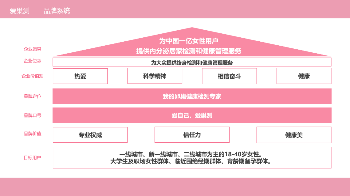 基于前期的调研工作,针对客户的新品牌进行品牌咨询,共创品牌定位“我的卵巢健康检测专家”、品牌名称“爱巢测”、品牌价值“专业权威、信任力、健康美”、品牌口号“爱自己,爱巢测”。并进一步为品牌产出品牌视觉形象、产品设计、包装设计及营销策略。