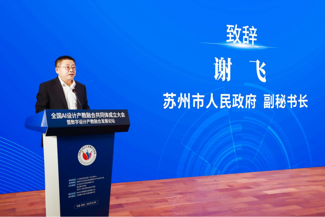 谢飞在致辞中表示,共同体的成立是深入贯彻落实国家战略、推进“人工智能+设计”产业高质量发展的重要举措,也是加强产教融合、促进AI设计产业发展的具体行动,将为苏州工艺美术职业技术学院等院校的专业发展提供更加广阔的空间,为企业提供更加优质的人才和技术支持。希望通过共同体平台,深化产教融合、促进技术创新、推动产业升级,为苏州、江苏乃至全国AI设计产业发展作出更大的贡献。