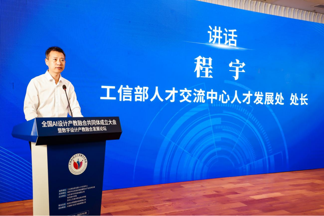 程宇在讲话中对大会的成功举办表示热烈的祝贺,并对共同体建设提出了三点要求。一要强调需求引领,实现共同体的供需对接。人才交流中心将指导共同体深入开展AI设计人才需求与急需紧缺岗位匹配相关的研究,助力共同体实现产业和需求侧的供需对接。二要汇聚产教资源,突出共同体的内涵建设。要发挥汇聚好产教双方的优势资源,在内涵建设上下功夫,协同共同体各参与方开展教材课程、人才培养体系等建设工作,切实提升人才培养改革成效。三要发挥评价作用,探索产教融合新模式。人才交流中心作为共同体的指导单位,也将进一步发挥AI设计领域专业的人才服务优势和资源整合能力,推出产教融合能力程度评估模型,探索推进AI设计人才的岗位能力认证,不断探索产教融合的新模式。