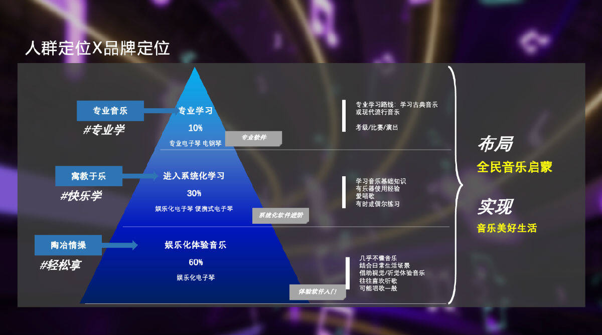 星海弹弹品牌定位过程中,门徒娱乐品牌咨询团队通过用户定性访谈,研究从婴儿到老年人等全年龄段的大众人群,门徒娱乐探索并提炼了大众消费者对智能乐器的深层需求,提炼了六类用户情绪价值,确定了星海新弹弹品牌的核心定位理念——让音乐零基础的人们都能在日常生活娱乐场景,轻松享受音乐、快乐学习音乐,从而实现“全民音乐启蒙”,帮助大众实现音乐美好生活的愿景。