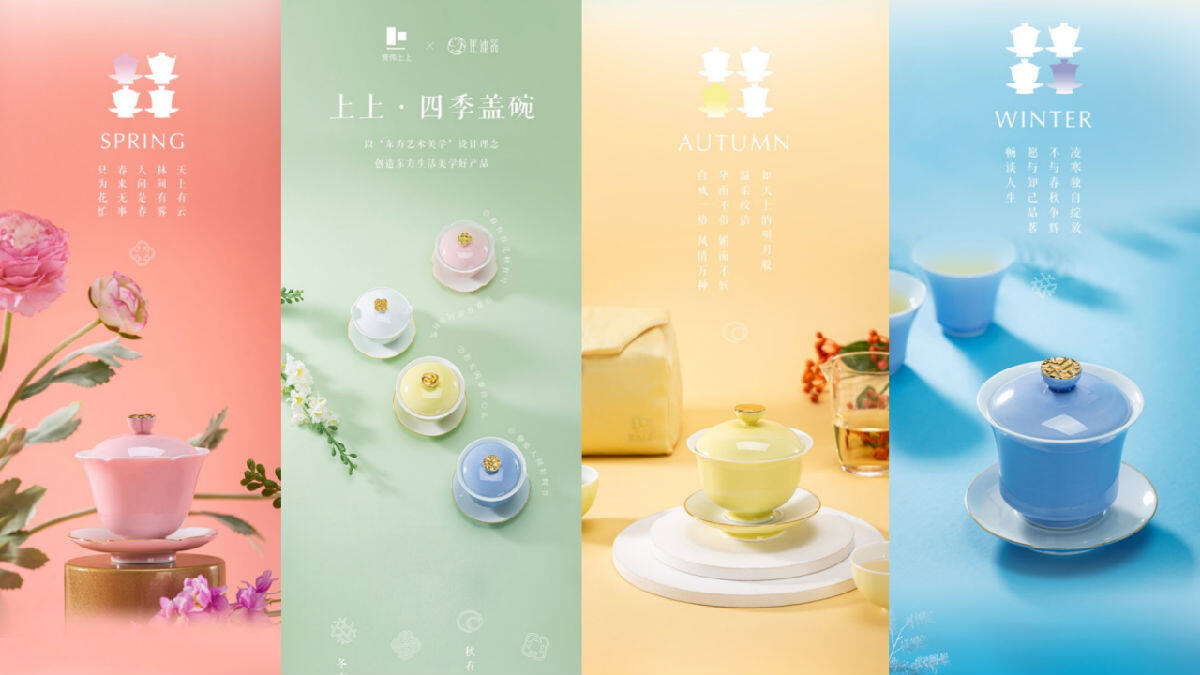 以四季盖碗为例,它不仅是一个实用的茶具,更是一种东方美学的象征。通过盖碗设计展现“春有百花秋有月,夏有凉风冬有雪”的意境,使用者能在品茶时体验到四季轮回的自然美学。