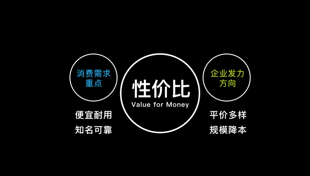 性价比(Value for Money)是消费者最早重视的标准,强调的是“便宜耐用、知名可靠”。在这一阶段,企业通过大规模降低成本,提供质优价廉的产品。消费者追求的是经济实惠,更多关注商品的功能性和使用成本。