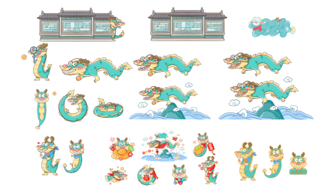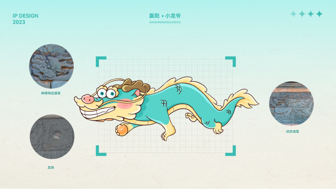 传说在襄阳王府绿影壁上刻有100条龙,但人们只能看到99条,其中一条龙偷跑出去寻找丢失的夜明珠。设计团队以此传说为灵感,打造出另一IP“小龙爷”,其通体碧绿,双眼呆萌,围着一条绣有“襄”字的红色围巾,并以此衍生出U型枕、玩偶、“万柿兴龙”新年贴纸、钥匙挂件等文创产品。