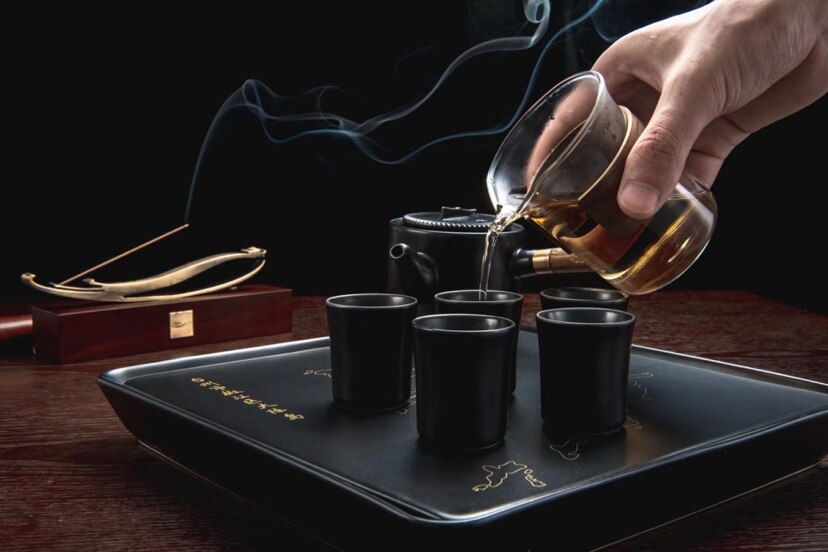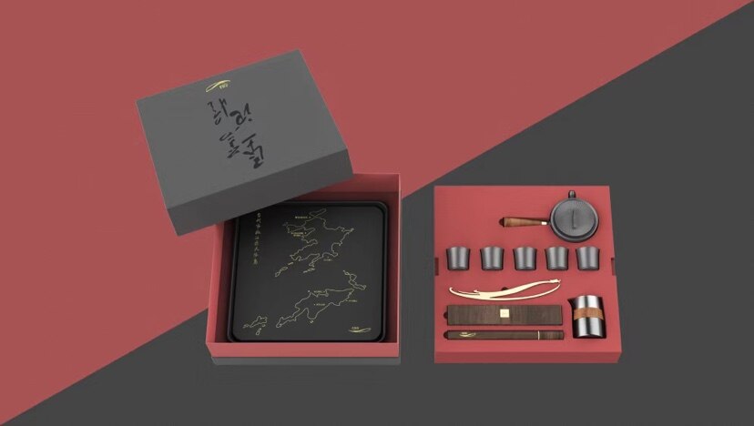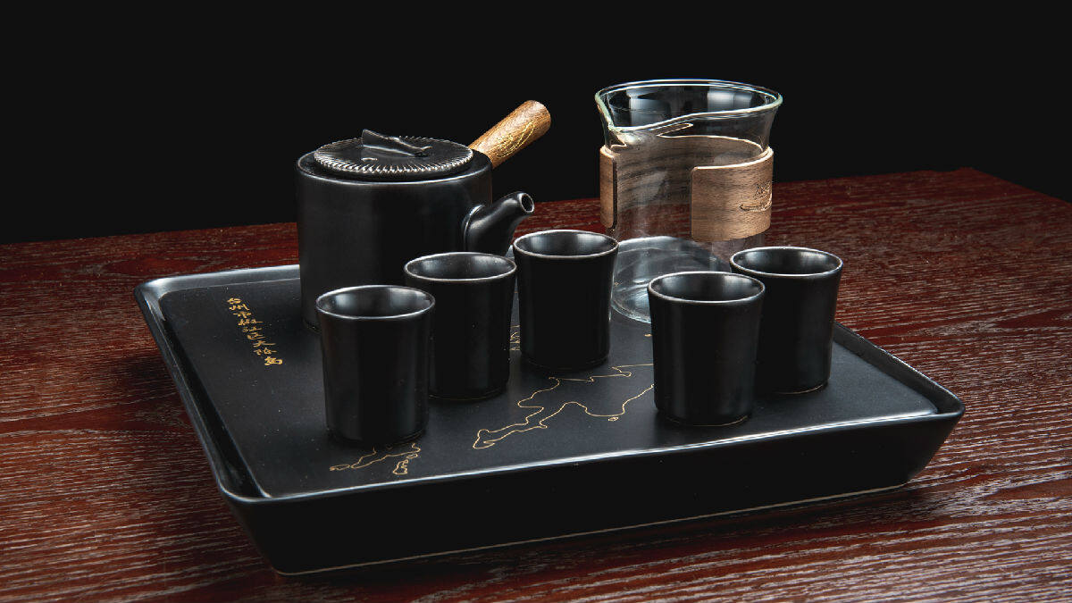 茶盘上丝印有大陈岛的地图轮廓,茶壶采用侧把壶设计,木头材质的把手和垦荒时使用的锄头把手相一致,壶盖上方的提钮也设计成了锄头样式。