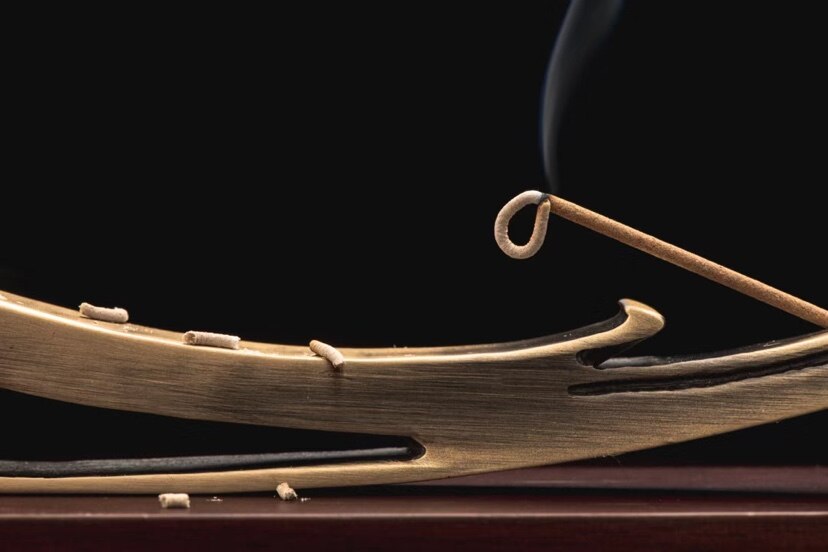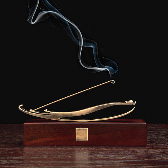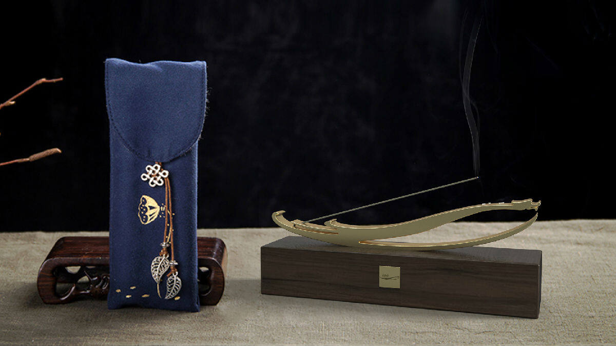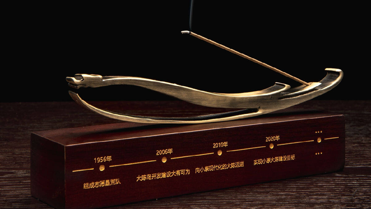 香台上方金属件以logo形态进行演变设计,下方香几上印有大陈岛垦荒的历程,铭记历史砥砺前行,香灰一点点落下的印记也代表着垦荒进展的一步一步成功。