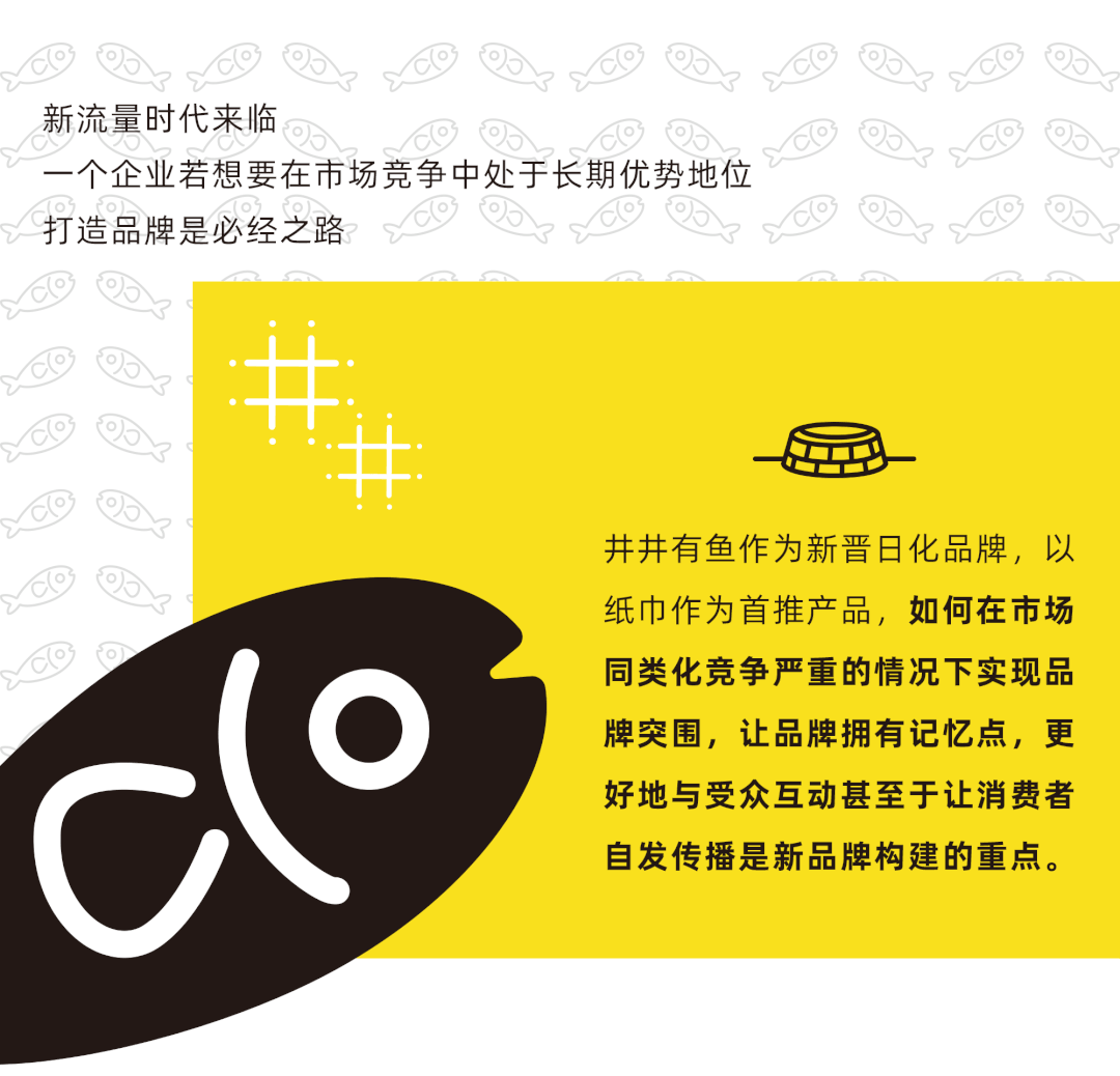 商品同质化的背后,是品牌意义的稀缺。区别于市面上其他品牌从产品概念,比如纸巾工艺、纸巾原材料等方面来提炼品牌核心价值,深圳门徒娱乐选择从人格化的视角为“井井有鱼”定位,希望将它打造成一个有感受,有温度,活泼亲切和用户无距离的品牌。